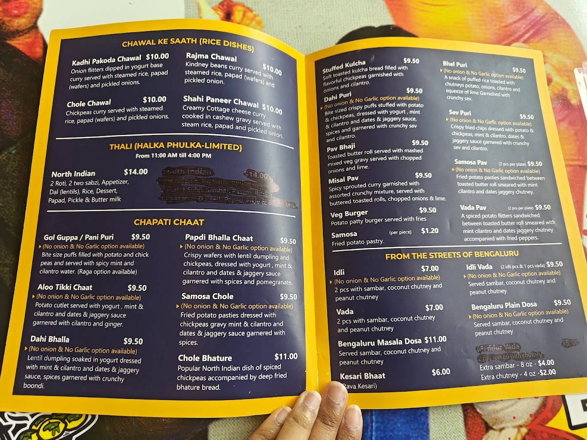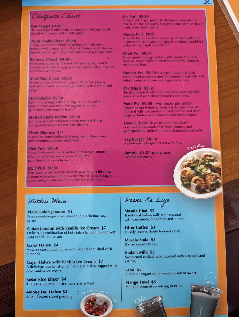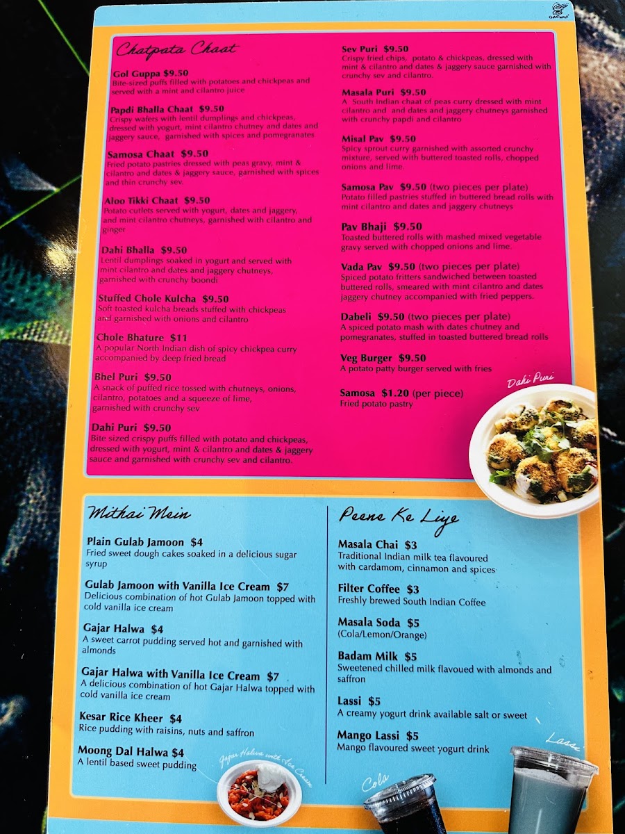 Fried potato pastries dressed with yellow peas gravy (ragda), dates & jaggery, cilantro & mint chutney. Garnished with spices and thin crunchy Sev.